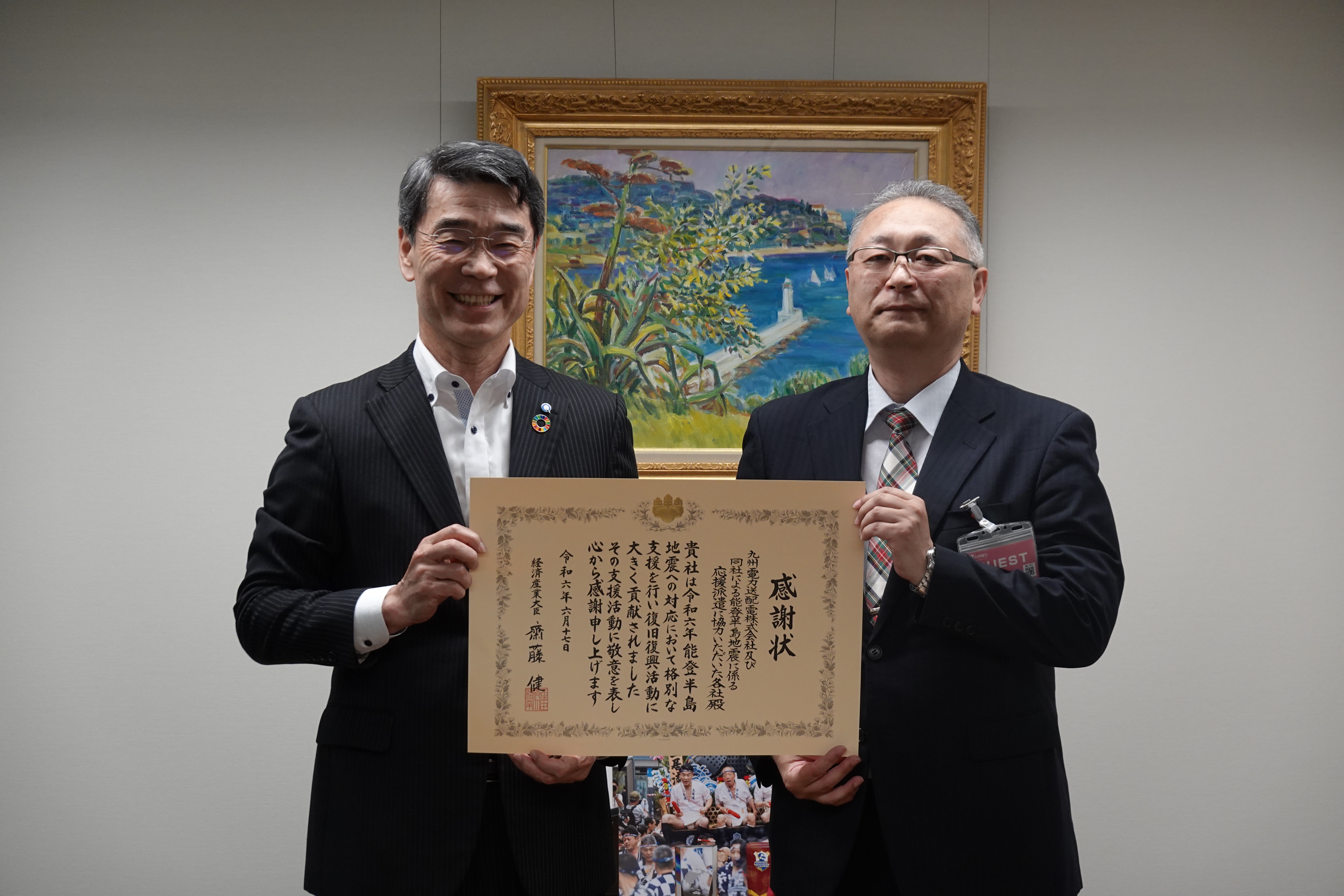 九州管内からは、九州電力送配電株式会社及び同社による能登半島地震に係る応援派遣に協力いただいた各社を代表して、九州電力送配電株式会社に対して感謝状を授与しました。